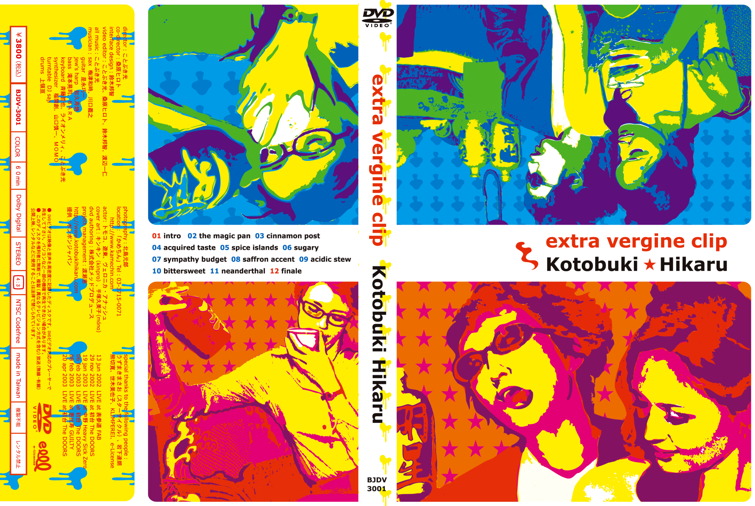 | DVDvideo『extra vergine clip』 all music:Kotobuki Hikaru ★収録曲 01.intro 02.the magic pan 03.cinnamon post 04.acquired taste 05.spice island 06.sugary 07.sympathy budget 08.saffron accent 09.acidic stew 10.bittersweet 11.neanderthal 12.finale |